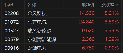 港股风电股持续活跃,其中,金风科技涨超5%,东方电气、瑞风新能源涨超3%,京能清洁能源涨1.3%,龙源电力跟涨。