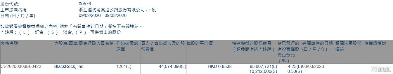 格隆汇3月9日丨根据联交所最新权益披露资料显示,2026年3月3日,浙江沪杭甬(00576.HK)遭BlackRock, Inc.在场内以每股均价6.8538港元减持好仓4407.44万股,涉资约3.02亿港元。
