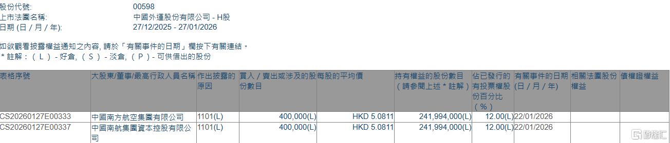 格隆汇1月27日丨根据联交所最新权益披露资料显示,2026年1月22日,中国外运(00598.HK)获中国南方航空集团有限公司在场内以每股均价5.0811港元增持40万股,涉资约203.24万港元。
