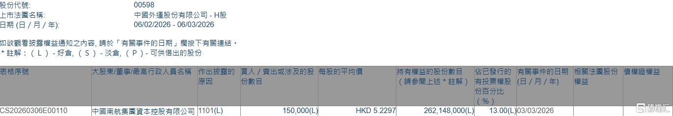 格隆汇3月6日丨根据联交所最新权益披露资料显示,2026年3月3日,中国外运(00598.HK)获中国南航集团资本控股有限公司在场内以每股均价5.2297港元增持15万股,涉资约78.45万港元。