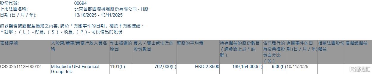 格隆汇11月13日丨根据联交所最新权益披露资料显示,2025年11月10日,北京首都机场股份(00694.HK)获Mitsubishi UFJ Financial Group, Inc.在场内以每股均价2.85港元增持76.2万股,涉资约217.17万港元。