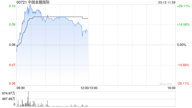 中国金融国际(00721)今早再一度涨超30%,昨日收涨38.60%。截至发稿,股价上涨10.13%,报0.087港元,成交额1100.59万港元。