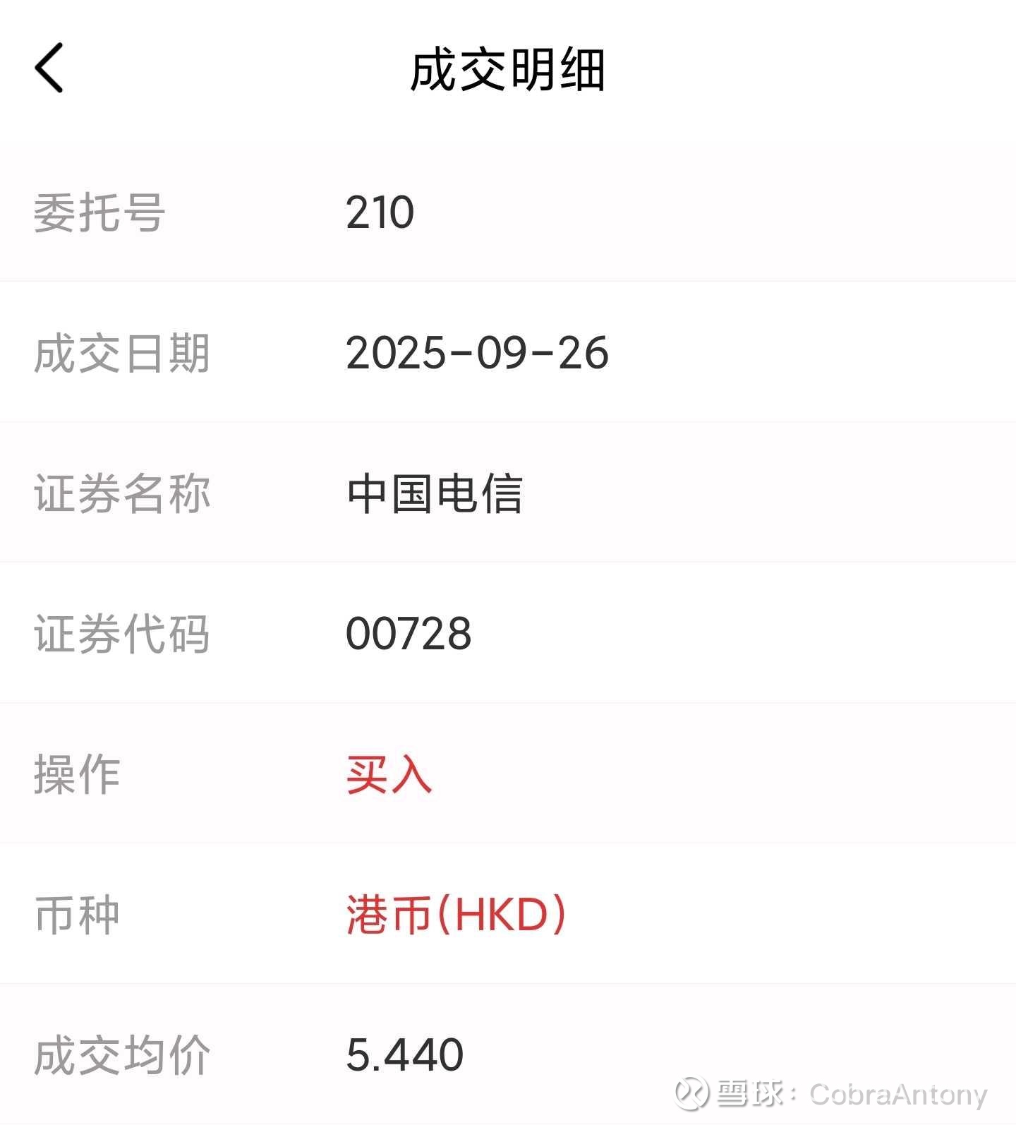 5.44加仓1/6中国电信港股股数。 以上的内容仅为个人日常投资的记录和感悟,不作为任何投资的依据和参考。