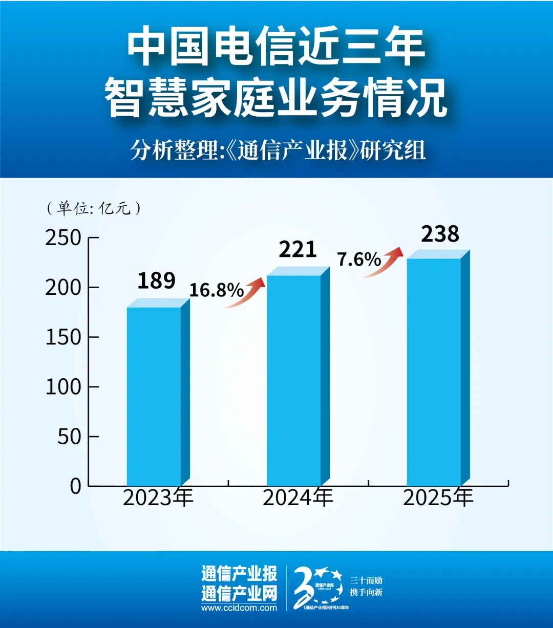 智慧家庭业务收入达238亿元,同比增长7.6%。