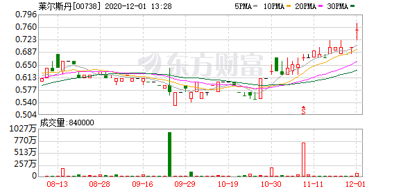 莱尔斯丹(00738-HK)截至11:32上涨10%,现报0.77港元,涨0.07港元。成交75万股,涉资56万元。