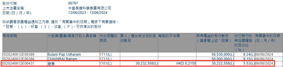 智通财经APP获悉,香港联交所最新资料显示,6月6日,严震增持中基长寿科学(00767)3023.2558万股,每股作价为0.215港元,总金额约为650万港元。增持后最新持股数目分别约为3023.26万股,最新持股比例为5.53%。