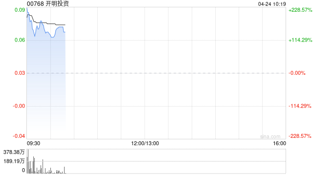 开明投资(00768)今早复牌一度飙升逾180%,截至发稿,股价上涨160.71%,现报0.073港元,成交额247.72万港元。