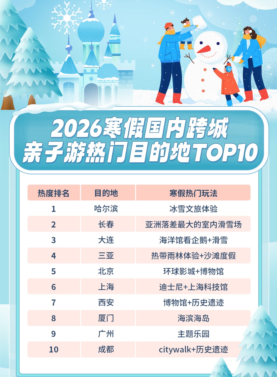 随着全国各地中小学陆续放寒假,亲子游热度快速攀升。截至1月28日,同程旅行平台过去一周内跨城亲子游产品的预订热度环比增长超过100%。热度相对较高的跨城亲子游目的地主要有哈尔滨、长春、大连、三亚、北京、上海、西安、厦门、广州、成都等。