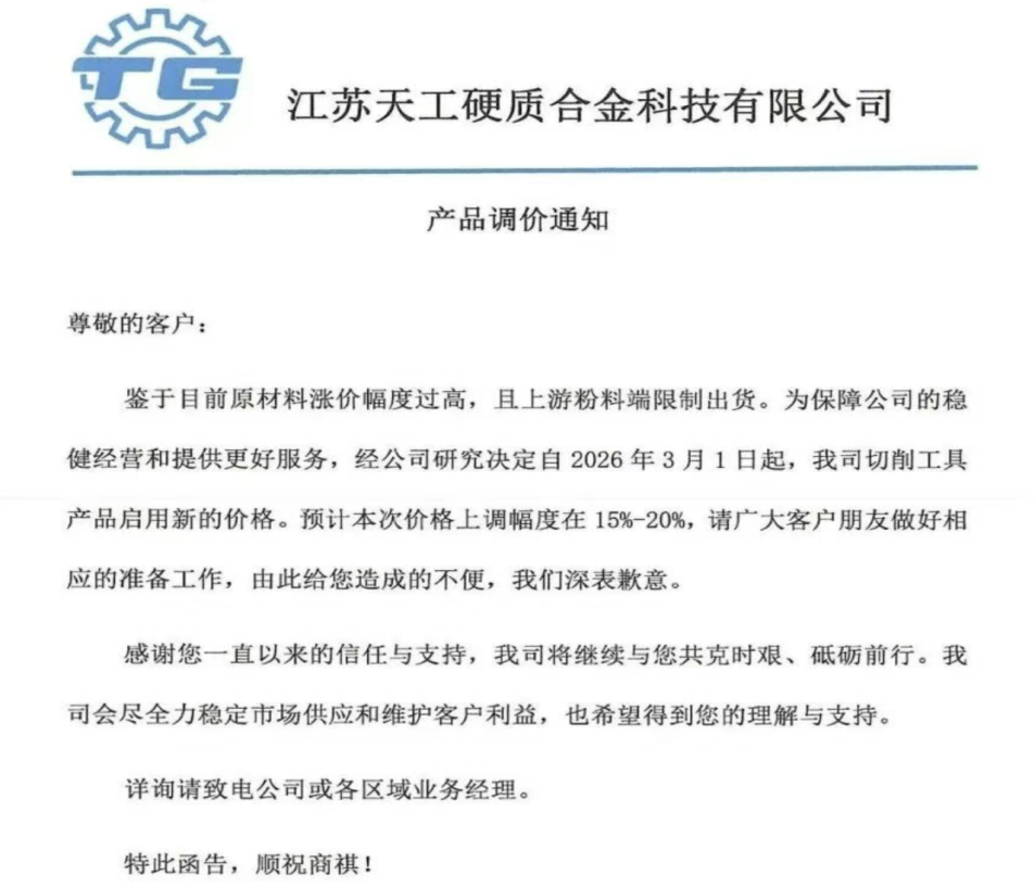 近日,切削工具厂商天工国际发布最新调价公告,宣布自3月1日起,切削刀具产品价格上调15%-20%——这已经是开年以来的第二次提价,1月底天工国际已对切削刀具产品上调价格15%-20%。