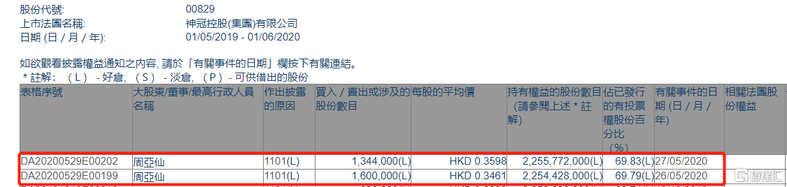 格隆汇APP获悉,根据联交所最新权益披露资料显示,2020年5月26日及5月27日,神冠控股(00829.HK)获执行董事兼董事会主席周亚仙在场内以每股均价0.3461港元及0.3598港元分别增持160万股及134.4万股;两日合计增持294.4万股,涉资约103.73万港元。