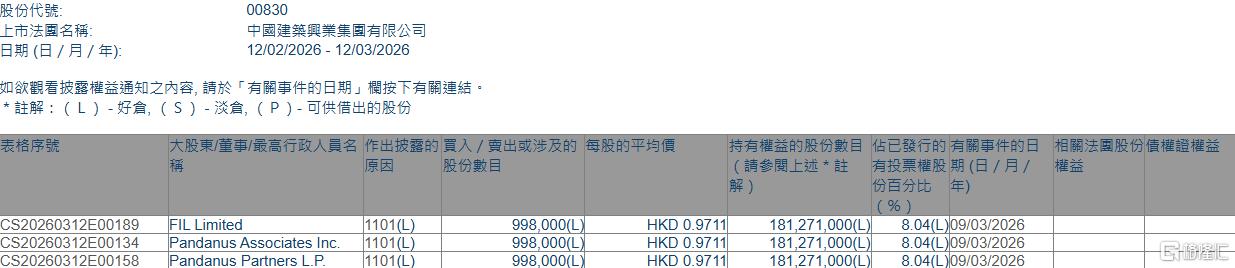 格隆汇3月12日丨根据联交所最新权益披露资料显示,2026年3月9日,中国建筑兴业(00830.HK)获FIL Limited在场内以每股均价0.9711港元增持99.8万股,涉资约96.92万港元。