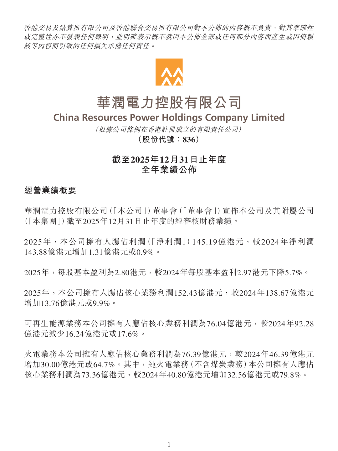 3月18日,華潤電力控股有限公司发布2025全年业绩。2025年,公司股东应占利润(净利润)为145.19亿港元,同比微增0.9%。可再生能源股东应占核心利润为76.04亿港元,较2024年下降了17.6%。