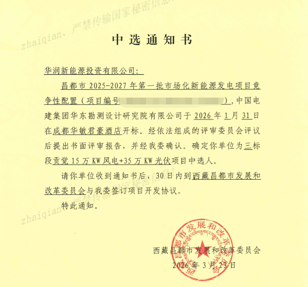 3月23日,华润电力四川公司收到西藏昌都市发展和改革委员会发来的《中选通知书》,该公司成功竞得昌都市贡觉县500MW风光项目开发指标,标志着华润电力在藏清洁能源开发取得重要突破。