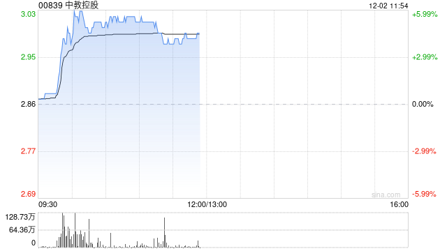 中教控股(00839)盘中涨超5%,截至发稿,股价上涨4.55%,现报2.99港元,成交额6911.76万港元。