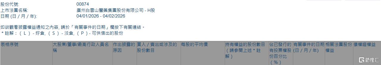 格隆汇2月4日丨根据联交所最新权益披露资料显示,2026年1月30日,白云山(00874.HK)获JPMorgan Chase & Co.以每股均价18.8482港元增持好仓36.06万股,涉资约679.7万港元。