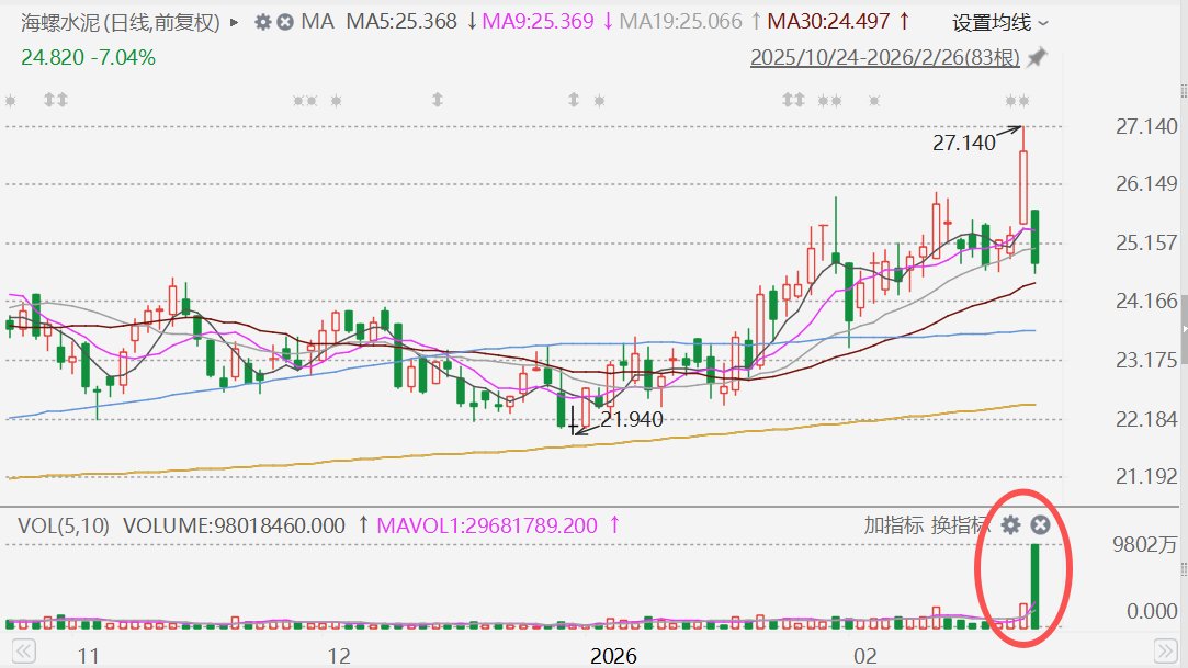 格隆汇2月26日|海螺水泥(0914.HK)今日放量大跌,盘中一度跌超7%至24.66港元,截至目前成交额放大至25亿港元。据观察,该股今早有多宗大手上板,每股作价25.7港元,涉7687.5万股,涉资19.76亿港元。