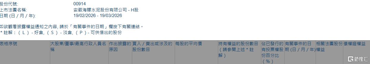 格隆汇3月19日丨根据联交所最新权益披露资料显示,2026年3月16日,海螺水泥(00914.HK)获FMR LLC在场内以每股均价22.7745港元增持332.25万股,涉资约7566.83万港元。