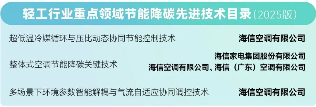 为加速推广先进适用节能降碳技术,推动重点领域节能降碳,促进轻工业绿色转型,中国轻工业联合会组织编制并形成了《轻工行业重点领域节能降碳先进技术目录(2025版)》,海信(广东)空调有限公司、海信家电集团股份有限公司、海信空调有限公司3项节能降碳成果入选。
