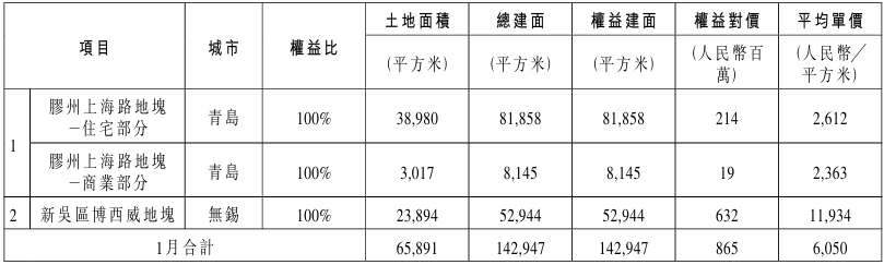 在土地储备方面,本集团于2026年1月新增两块土地,建筑面积和权益建筑面积均为14万平方米,权益地价8.65亿元。