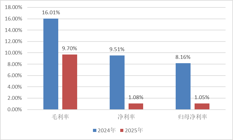 期内,毛利润为94.3亿元,同比下降54%;毛利率为9.7%,较2024年16%大幅下降了6.3个百分点。净利润为10.5亿元,同比下降91%,净利率1.08%,较2024年9.5%下降了8.4个百分点。