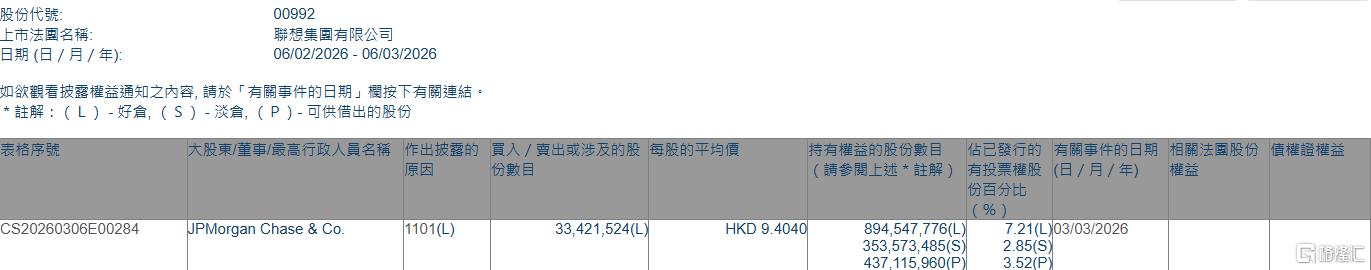 格隆汇3月6日丨根据联交所最新权益披露资料显示,2026年3月3日,联想集团(00992.HK)获JPMorgan Chase & Co.以每股均价9.404港元增持好仓3342.15万股,涉资约3.14亿港元。