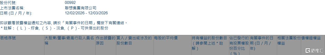 格隆汇3月12日丨根据联交所最新权益披露资料显示,2026年3月6日,联想集团(00992.HK)获JPMorgan Chase & Co.以每股均价9.3837港元增持好仓1965.58万股,涉资约1.84亿港元。