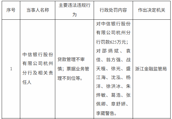 罚单显示,中信银行杭州分行的主要违法违规事实(案由)为:贷款管理不审慎;票据业务管理不到位等。