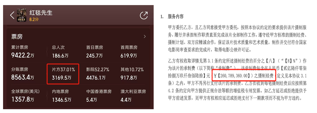 根据猫眼数据测算,欢喜传媒作为主投方能参与分配的票房收入仅约3169.50万元。而据公司2022年初公开披露的电影承制协议显示,《红毯先生》的摄制经费总额高达2.61亿元。由此可见,欢喜传媒单在这一个项目上的亏损就超过2.23亿元。