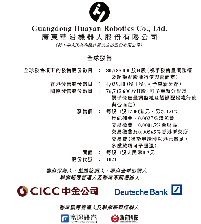 来自广东佛山顺德区的华沿机器人(01021.HK),于今日起至下周三(3月25日)招股,预计2026年3月30日在港交所挂牌上市,中金公司、德意志银行联席保荐。