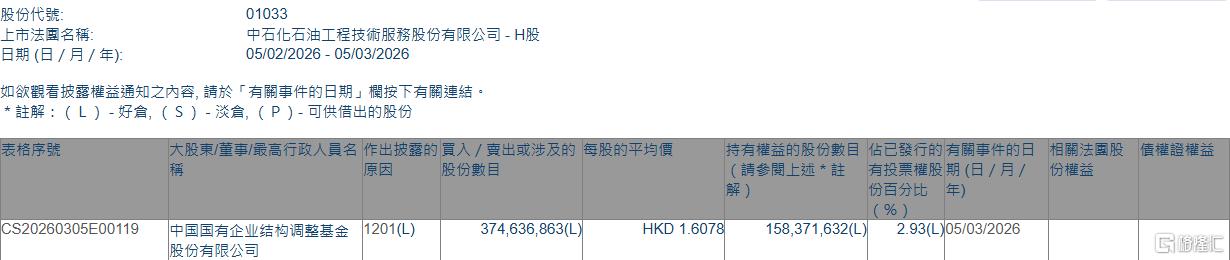 格隆汇3月5日丨根据联交所最新权益披露资料显示,2026年3月5日,中石化油服(01033.HK)遭中国国有企业结构调整基金股份有限公司在场内以每股均价1.6078港元减持约3.75亿股,涉资约6.02亿港元。
