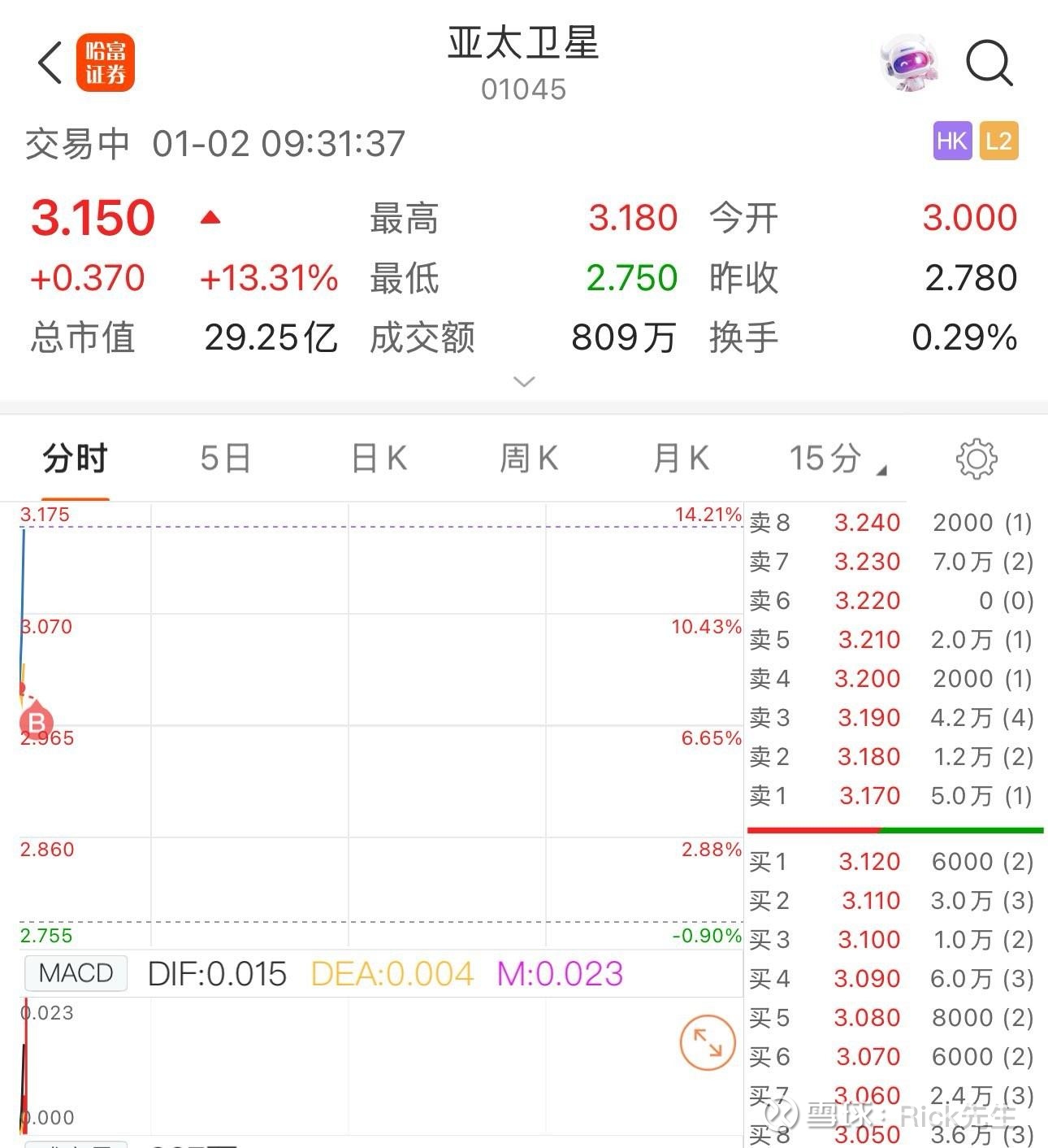 公布一下答案:亚太卫星。 前几天已经卖了2/3了,所以截止到现在累计也才赚20%+,很拉胯。这是卫星板块里面,为数不多比较靠谱的。剩下的到1PB左右就准备清了,不做推荐,只做记录。这类公司的市值太小了,所以不太方便讲明。以后有类似的机会参与,也不太会讲明。