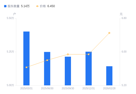 近一年(2025年2月28日至2026年2月28日),创业环保A股股东户数从5.42万户,减低至5.14万户,降幅5.05%,区间股价上涨14.36%。