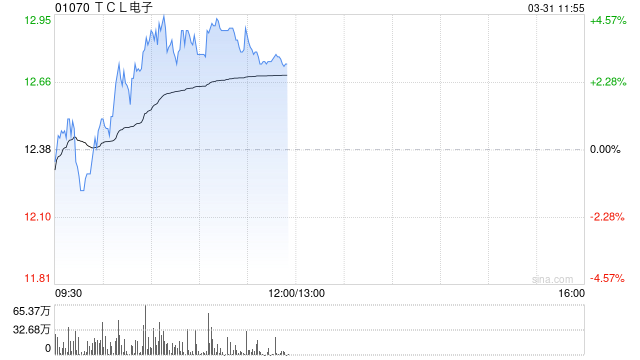 TCL电子(01070)盘中涨超4%,截至发稿,股价上涨3.15%,现报12.77港元,成交额2.28亿港元。