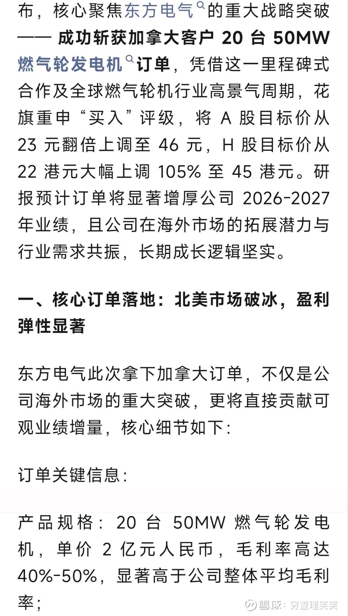花旗发表报告,重申对东方电气(01072.HK)“买入”评级,因其取得关键战略突破,公司已从加拿大客户获得20台50MW燃气轮机发电机组的里程碑式订单,单价为2亿元人民币,毛利率达40-50%。