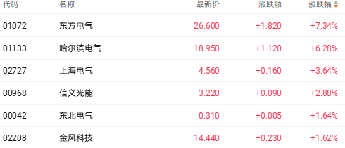 财联社1月16日讯今日港股电力设备股表现活跃。截至发稿,东方电气(01072.HK)涨7.34%、哈尔滨电气(01133.HK)涨6.28%、上海电气(02727.HK)涨3.64%、信义光能(00968.HK)涨2.88%。