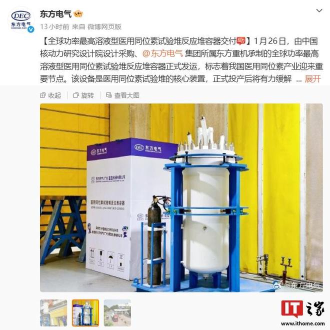 IT之家 1 月 27 日消息,东方电气今日宣布,由中国核动力研究设计院设计采购、东方电气集团所属东方重机承制的全球功率最高溶液型医用同位素试验堆反应堆容器正式发运,标志着我国医用同位素产业迎来重要节点。