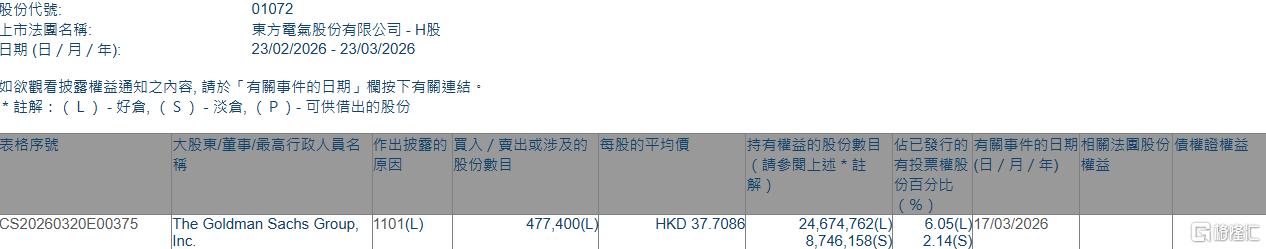 格隆汇3月23日丨根据联交所最新权益披露资料显示,2026年3月17日,东方电气(01072.HK)获The Goldman Sachs Group, Inc.在场内以每股均价37.7086港元增持好仓47.74万股,涉资约1800.21万港元。