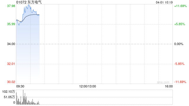 东方电气(01072)绩后一度涨超11%,截至发稿,股价上涨9.65%,现报37.28港元,成交额4.64亿港元。