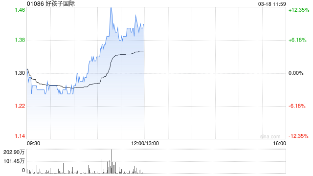 好孩子国际(01086)早盘一度涨超12%,截至发稿,股价上涨8.46%,现报1.41港元,成交额3962.68万港元。