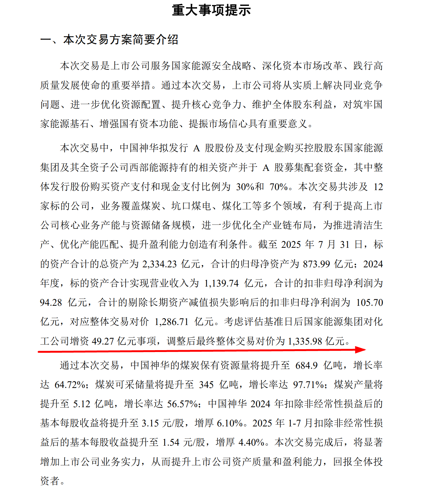 财联社12月19日讯,中国神华今日公告称,拟通过发行A股股份及支付现金的方式购买国家能源集团持有的国源电力100%股权、新疆能源100%股权、化工公司100%股权、乌海能源100%股权、平庄煤业100%股权、神延煤炭41%股权、晋神能源49%股权、包头矿业100%股权、航运公司100%股权、煤炭运销公司100%股权、港口公司100%股权,并以支付现金的方式购买西部能源持有的内蒙建投100%股权;同时,上市公司拟向不超过35名特定投资者发行A股股份募集配套资金。交易价格1335.98亿元。