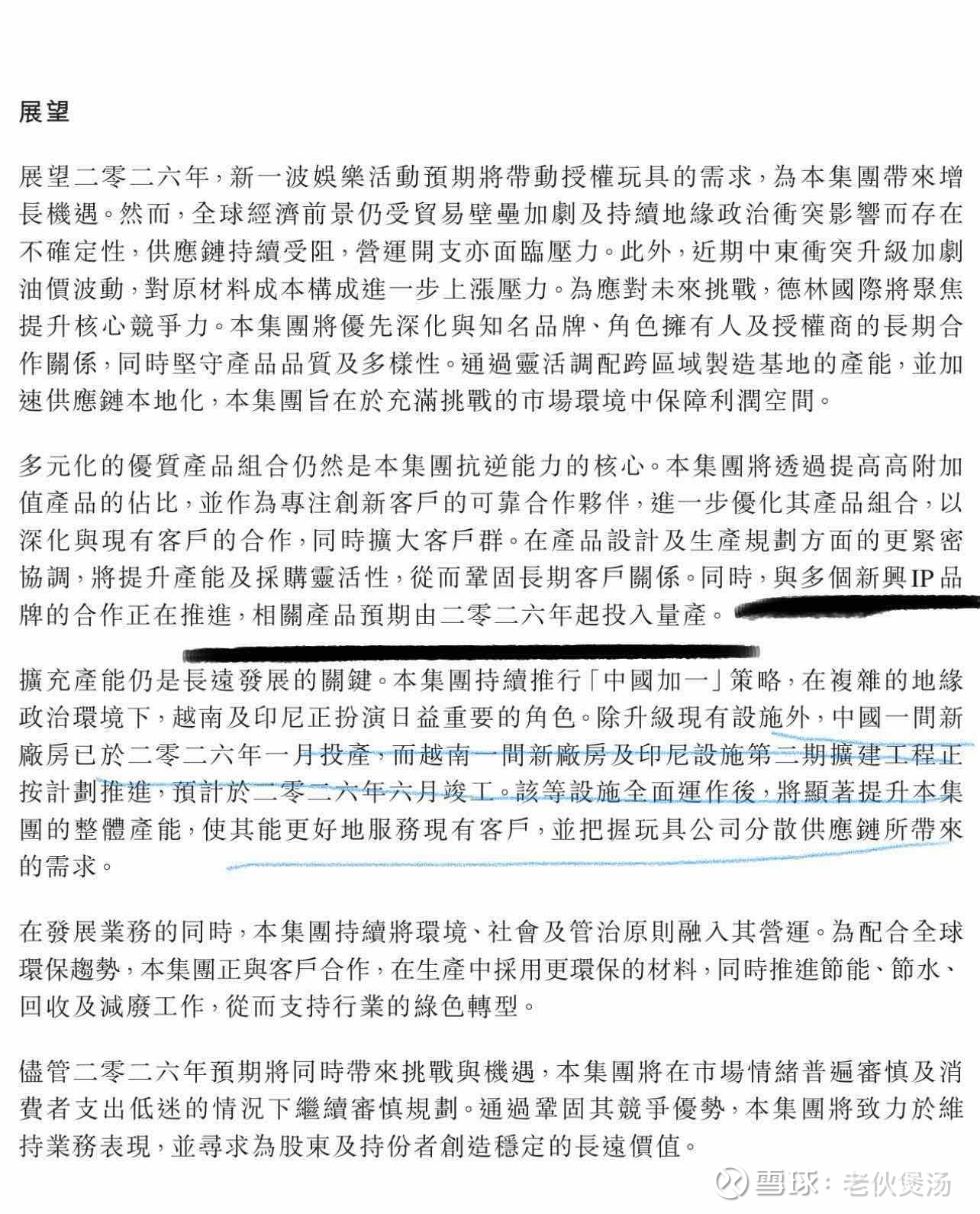 : 德林国际2026年1月有一个国内新工厂投产,同时2026年6月还有越南和印尼的新厂房竣工。泡泡玛特有分散供应链的需求以应对关税的不确定性,德林国际2025年年报已经说了,与多个新兴IP品牌合作正在推进,2026年进入量产。
