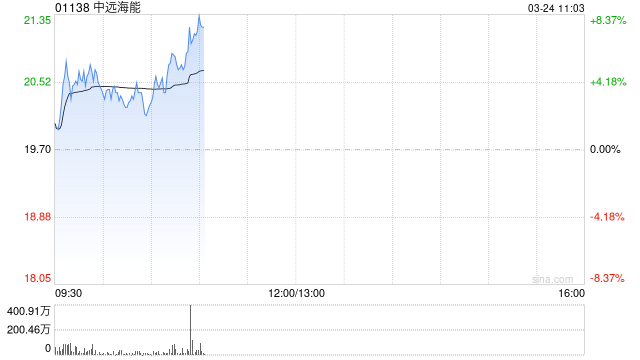 中远海能(01138)盘中涨超5%,截至发稿,股价上涨3.86%,现报20.46港元,成交额3.975亿港元。