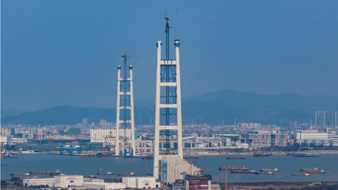 狮子洋通道项目建设面临多重世界级难度:为匹配珠江口日均通航超700艘次的繁忙航道,大桥采用2180米主跨“一跨过江”设计;为同时承载双层、16车道带来的超20万吨竖向荷载,342米高的世界最高双层悬索桥主塔应运而生。