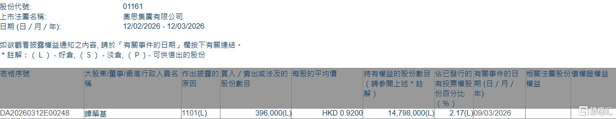 格隆汇3月12日丨根据联交所最新权益披露资料显示,2026年3月9日,奥思集团(01161.HK)获执行董事兼行政总裁谭肇基在场内以每股均价0.92港元增持39.6万股,涉资约36.43万港元。