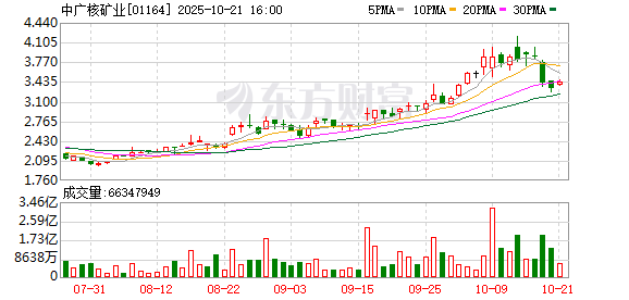 10月21日,中广核矿业(01164)发布公告,2025年第三季度,公司旗下投资的矿山共生产天然铀644.3tU,本季度计划完成率为96.5%。