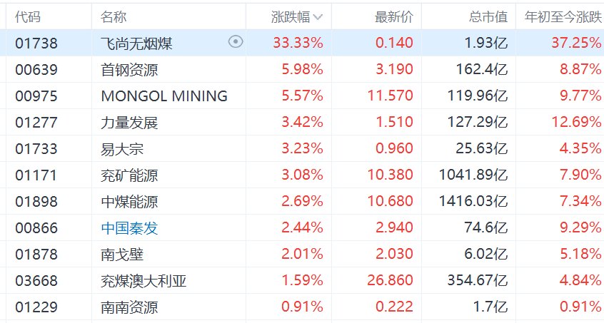 格隆汇1月7日|港股市场煤炭股走强,其中,飞尚无烟煤涨33%,首钢资源、MONGOL MINING涨超5%,力量发展、易大宗、兖矿能源涨超3%,中煤能源、中国秦发、南戈壁涨超2%。消息面上,焦煤期货触及涨停,涨幅8%报1164元/吨;焦炭期货主力合约日内涨超7%报1757元/吨。