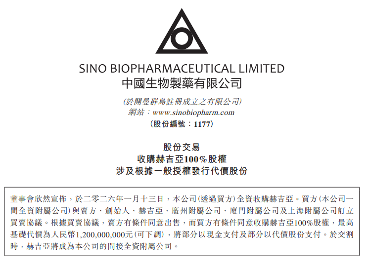 2026年1月13日,中国生物制药(1177.HK)发布公告,将以总价12亿元人民币,全资收购国内小干扰核酸(siRNA)领域创新药企——杭州赫吉亚生物医药有限公司(以下简称“赫吉亚”)。通过此次收购,中国生物制药一举斩获了siRNA赛道领先的自主技术平台、多元化产品管线及专业研发团队,进一步丰富了集团在大慢病领域的管线布局。