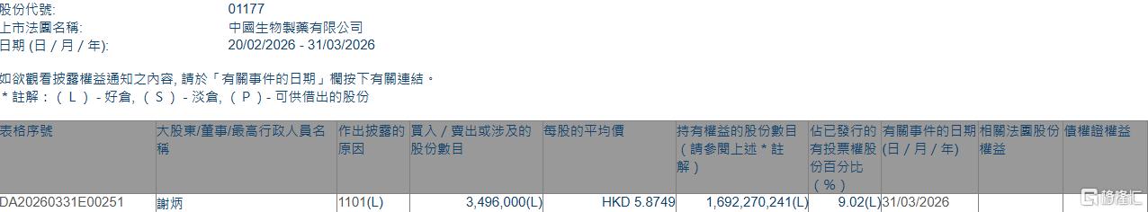 格隆汇3月31日丨根据联交所最新权益披露资料显示,2026年3月31日,中国生物制药(01177.HK)获执行董事谢炳在场内以每股均价5.8749港元增持349.6万股,涉资约2053.9万港元。