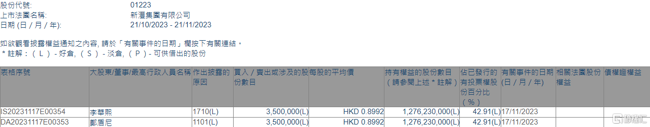 格隆汇11月21日丨根据联交所最新权益披露资料显示,2023年11月17日,新沣集团(01223.HK)获执行董事郑盾尼(主席及首席执行官)在场内以每股均价0.8992港元增持350万股,涉资约314.72万港元。