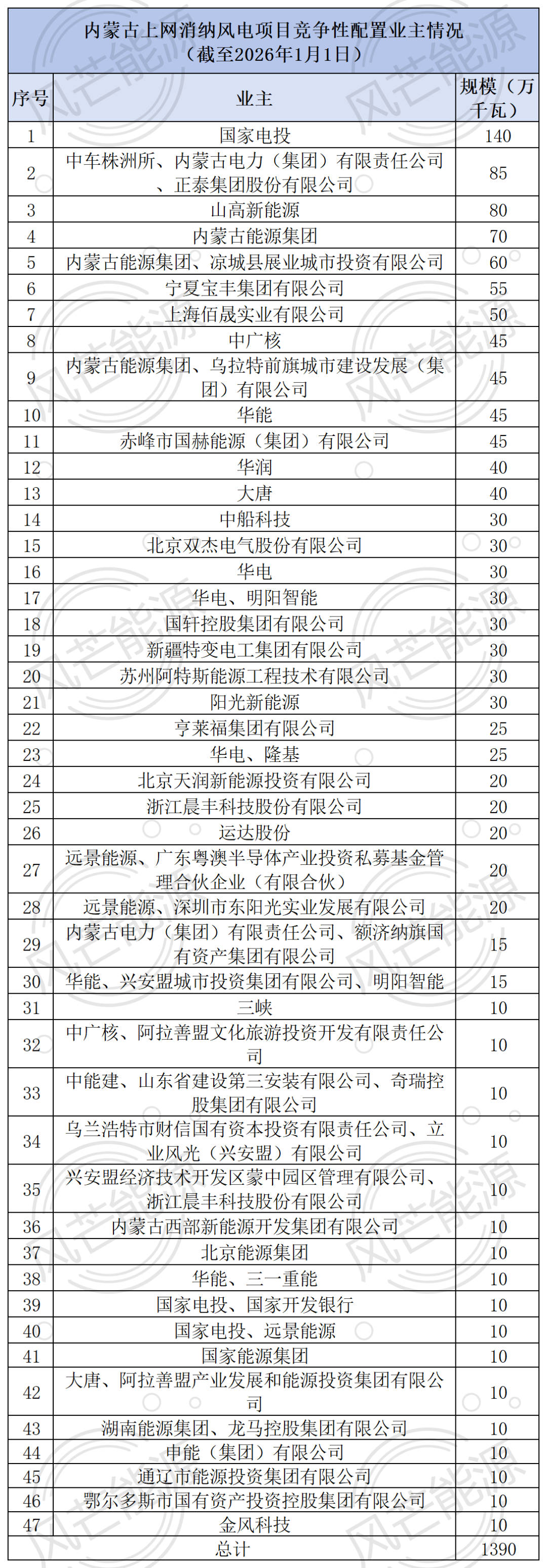 业主方面,国家电投获取本批次风电指标最多,为140万千瓦(含120万千瓦国家电投集团“乌兰察布风电外送基地”拟转本地消纳项目在内);其次为中车株洲所、内蒙古电力(集团)有限责任公司、正泰集团股份有限公司组成的联合体,获取了85万千瓦风电指标;山高新能源获取80万千瓦指标。